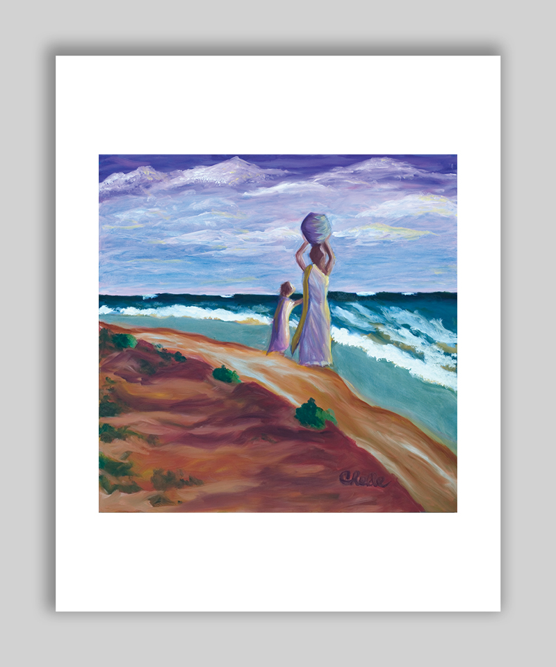 Archival print of a painting of a mother and child on the beach.