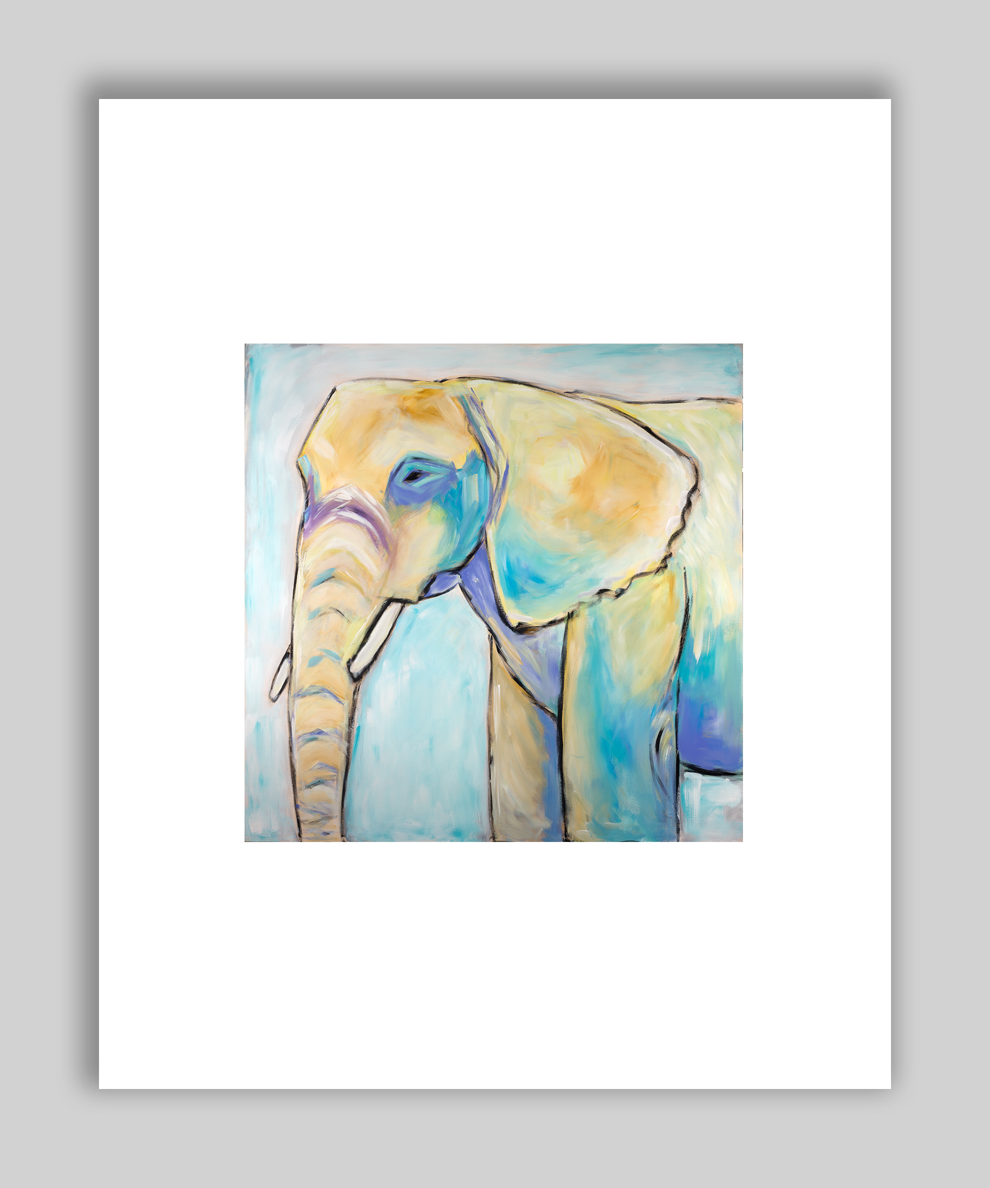 Archival print of a painting of an elephant with blue background.