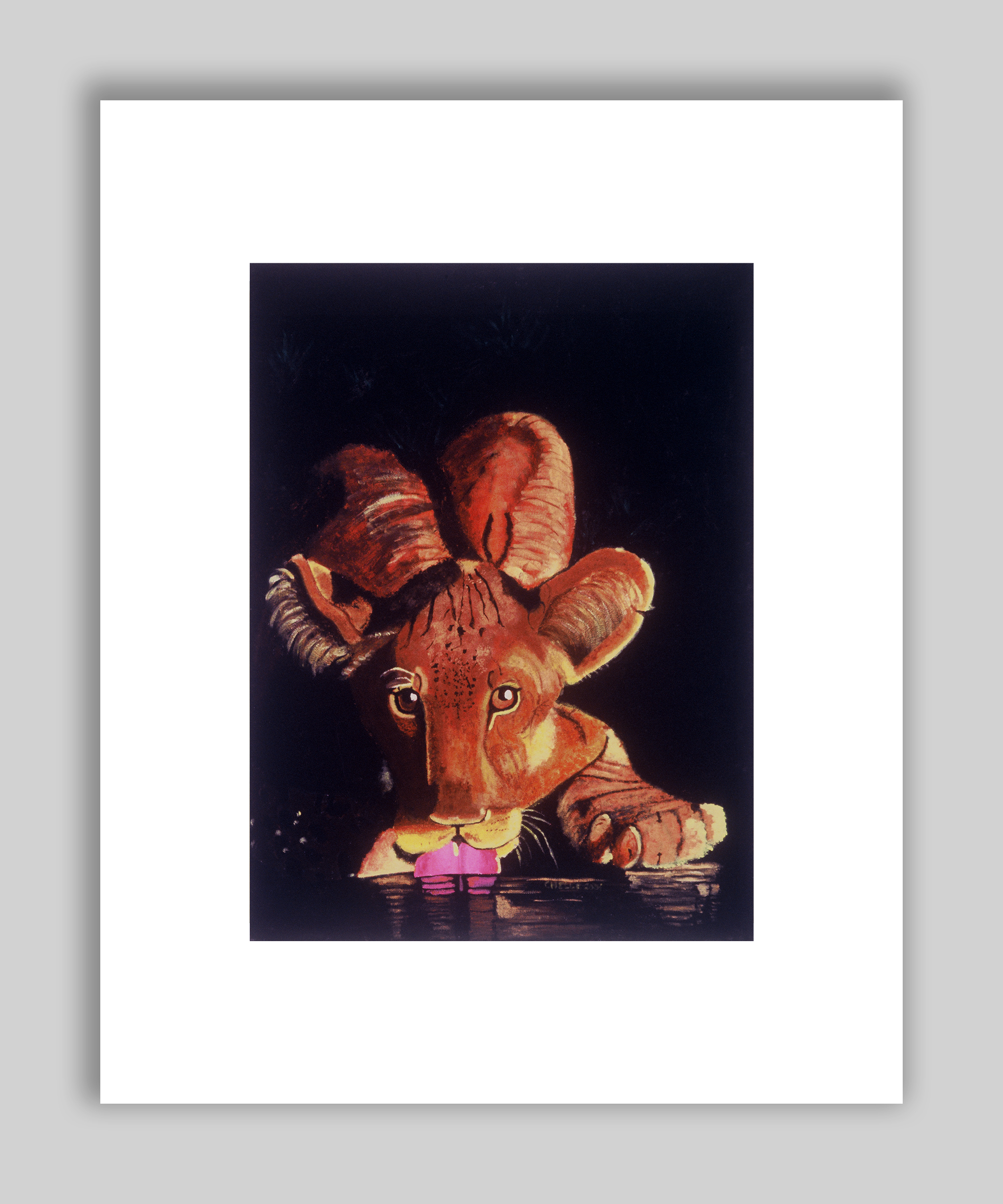 Archival print of a painting of a lion cub drinking from a pond.